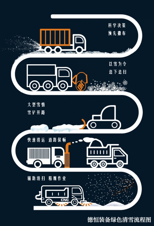 经过不断的探索与创新,德恒装备已拥有一套成熟的除雪工艺流程,包括从雪前的科学决策,到雪中的匹配合理的除雪设备,再到雪后的评估与改进,可根据道路,气候等情况为客户量身定制除雪作业方案。