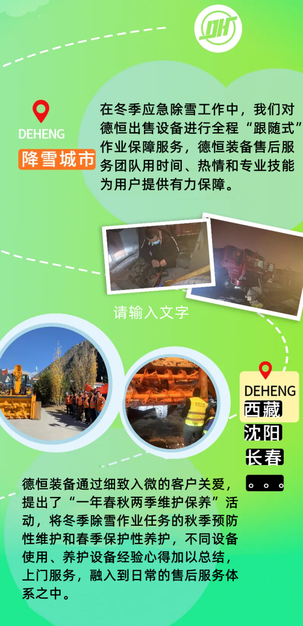 乘着温暖的春风,携着如画的美景,德恒装备售后服务团队开始了设备春季检修保养活动,以高品质的服务为各地客户设备保驾护航。 德恒装备一直秉持着“客户为先,服务至上”的售后服务理念,为更好的服务客户,德恒装备建立了一套“伴随式除雪作业服务、春秋两季免费保养”的完善售后服务体系。 另外,德恒在全国设有10余座维修站,并在多个城市设立售后服务中心,配件充足,可提供专业的产品培训,为客户提供零距离全方位的售后保障,让客户全程无忧。